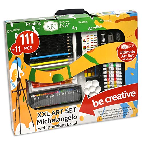 Artina 122tlg XXL Malset mit Staffelei Michelangelo – Künstler Set Acryl & Zeichenset – Buntstifte, Leinwand, Pinselset…