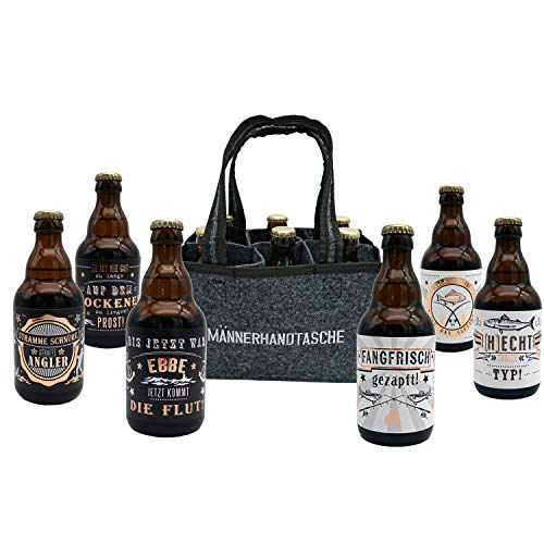 🍺 MÄNNERHANDTASCHE mit 6 verschiedenen witzigen Bierflaschen für den Angler (á 0,33 l)