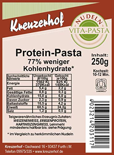 Die Kreuzerhof Eiweißnudeln sind ideal für ganz Fitness- und Sportbegeisterte, die sich eiweißreich und kohlenhydratarm ernähren wollen, ohne nachdem auf leckere Pasta zu verzichten. Wenig Kohlenhydrate, üppig an Eiweiß, 100 % natürlich – hochwertige Proteinnudeln, die dem Geschmack normaler Nudeln ausgesprochen nahekommen. Mit diesen leckeren Protein Nudeln ist Pasta essen aka abends ein purer Genuss ohne schlechtes Gewissen.